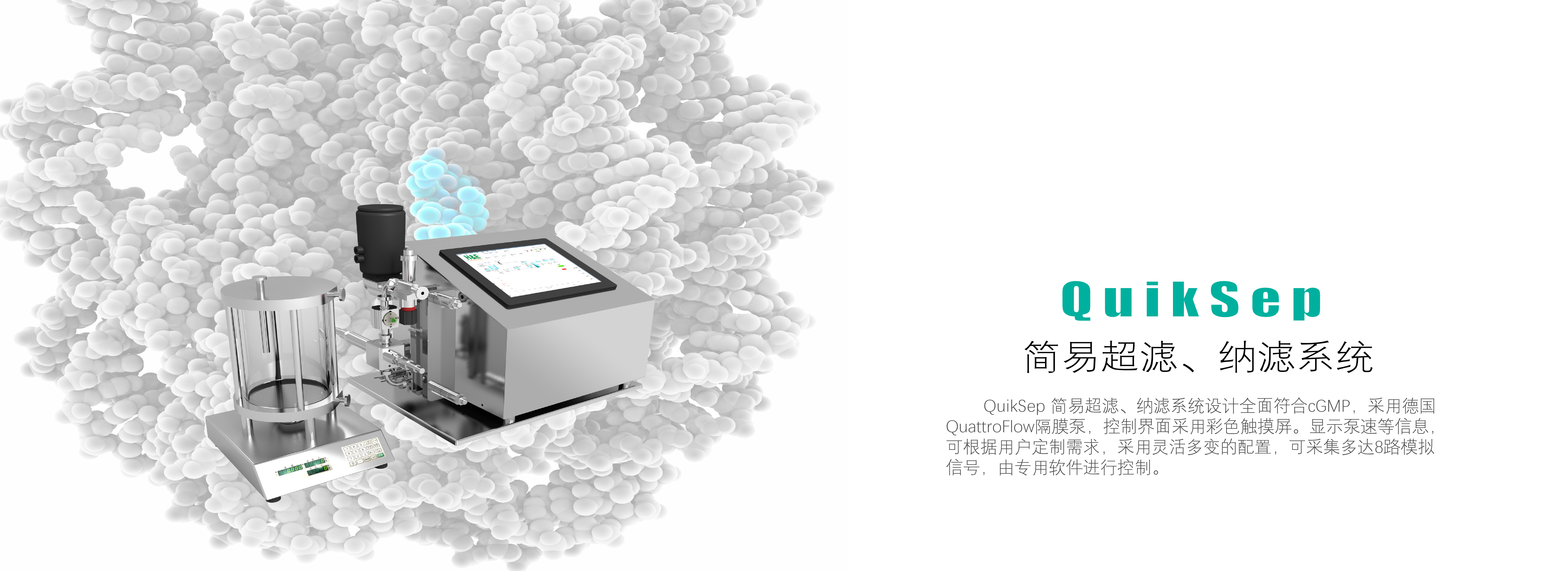 QuikSep SF簡易超濾系統設計全面符合cGMP,采用德國QuattroFlow隔膜泵,控制界面采用彩色觸摸屏,顯示泵速等信息,能實時監測壓力及TMP變化,透過端紫外變化,并可設置各參數報警值,也可實現恒壓運行或恒定TMP運行,保證工藝可控性