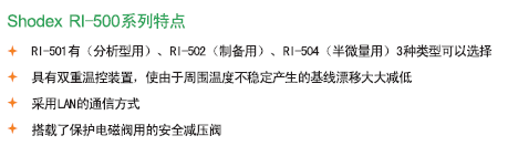 RI-501是對應于標準尺寸分析色譜的機種;RI-502是對應于制備型色譜的機種;RI-504是對應于半微量型色譜的機種。這些機器最大限度的抑制了峰的變寬現象,是最先進的RI檢測器。根據使用不同尺寸色譜柱的選擇不同的機種,能最大限度的發揮色譜柱的分析能力。請根據您的實際用途選擇。