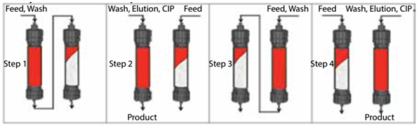 ? ? ?傳統(tǒng)層析工藝,由于流穿效應(yīng),有40-60%的填料是無法被利用的,從而使得載量和處理量大為受限。Capture SMB用于優(yōu)化捕獲環(huán)節(jié),作為最簡單和最優(yōu)化的2柱位設(shè)計,可使純化效率顯著提高,并且使填料用量大為縮減。