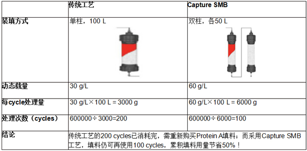 ? ? ?Capture SMB是將第一根層析柱的抗體/蛋白流穿繼續(xù)上樣至第二根層析柱,待第一根層析柱完全滿載后,方結(jié)束其上樣進行淋洗,并繼續(xù)進行洗脫、再生、再平衡操作,而此時第二根層析柱會獨立進行上樣操作。通過切換柱位操作,保證2根層析柱的洗脫、再生、上樣等操作交替銜接進行,從而實現(xiàn)工藝與系統(tǒng)硬件設(shè)計的完美結(jié)合,使填料利用率最大化,累積用量大為縮減。