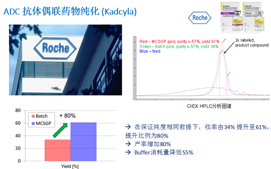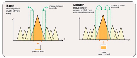 ? ? ?MCSGP工藝,可將含有不純組分的產(chǎn)品回收在一個封閉的環(huán)內(nèi),進行循環(huán)式的層析操作,從而最大限度地提取純產(chǎn)品,使得收率和純度二者兼得。