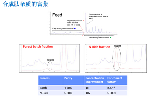 ? ? ??N-Rich工藝是微量物質(zhì)的富集過程,比如將產(chǎn)品的相關(guān)雜質(zhì)選擇性地富集在一個循環(huán)的層析過程中,待富集至目標量,再進行洗脫回收。該方法特別適用于分離與產(chǎn)品有關(guān)的雜質(zhì),如異構(gòu)體和聚集體,并同時用于發(fā)現(xiàn)研究。