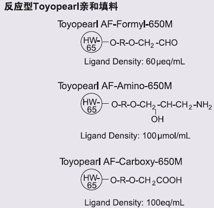 ??? 在溫和的條件下,Toyopearl AF-Formyl-650M(含醛基)唯一與伯胺耦合,形成穩定的仲胺鍵。多種工業用酶都能固定于含醛基的填料上。通常,工業用戶用部分氧化多糖支持物(如纖維素和瓊脂糖)或部分水解聚縮醛合成這些填料。相比之下,TOYOPEARL AF-Formyl-650M是一個即用型含醛基穩定的大孔徑填料。東曹公司可以保證每批的醛含量以及物理性質保持一致。
