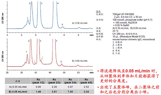 ?????? 抗體藥物中使用的單克隆抗體,在生產、貯藏或運輸過程中可能會形成二聚體等凝聚物,存在引發不良反應的風險因素,故在質量控制中采用體積排阻色譜法(SEC)對單克隆抗體進行分離分析。現有的TSKgel?G3000SWXL色譜柱常用于此用途,但仍需要更高分離度以及更短分析時間的SEC分析技術?,F在2μm粒徑的高性能SEC?色譜柱TSKgel?UP-SW3000已實現了商品化,給您帶來更高效更快捷的分離體驗!