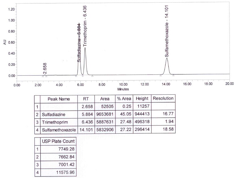 ??? 下圖是用Merck Hibar Purospher STAR LP 柱,使用藥典的方法,對聯磺甲氧芐啶片中磺胺甲噁唑、磺胺嘧啶和甲氧芐啶含量進行測試的譜圖,請參考。