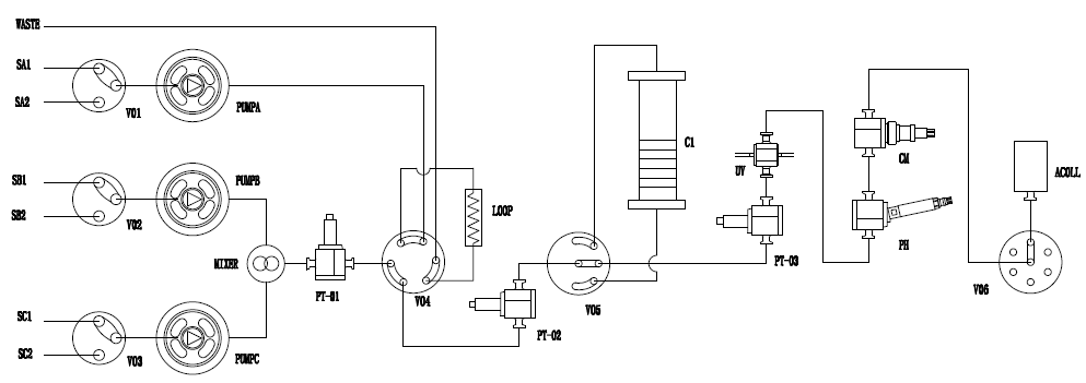 * 本系統采用流路最小化設計,器件之間十分緊湊,整體流路容積很小。流路為標準手緊接頭連接固定,方便快捷的同時,大幅度減小系統死體積。