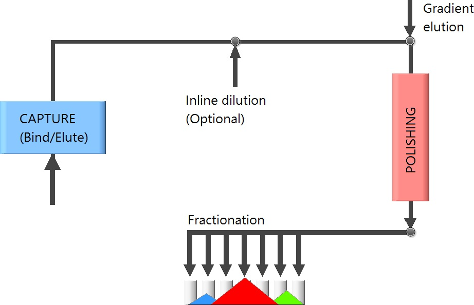 Contichrom系統可以將兩個層析步驟(例如捕獲和精純)整合為一個單一的過程,第一步層析洗脫的產物可以直接被稀釋,從而直接進行第二步層析,因此省略了中間的間歇過程,這是非常適用于高生產量純化的。