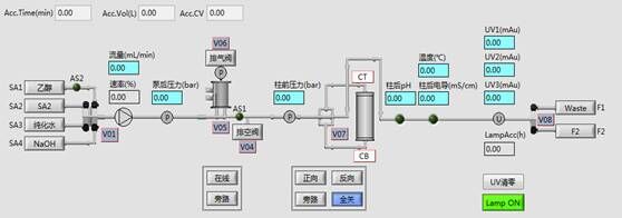 層析系統(tǒng)軟件符合新版GMP規(guī)范,采用圖形化界面、全自動操作,簡明扼要,任何操作及狀態(tài)均可實時顯示在主界面狀態(tài)欄中,自動化程度高。結(jié)合了大量的容錯性設(shè)計,貼合生產(chǎn)實際,降低了對研發(fā)人員的技能要求。