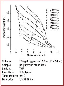 3. Hhr型色譜柱為常規(guī)的GPC色譜柱,尺寸為7.8mm ID×30cm。當(dāng)使用此類常規(guī)色譜柱時(shí),大多數(shù)的HPLC系統(tǒng)無(wú)需進(jìn)行針對(duì)柱外峰展效應(yīng)的優(yōu)化。