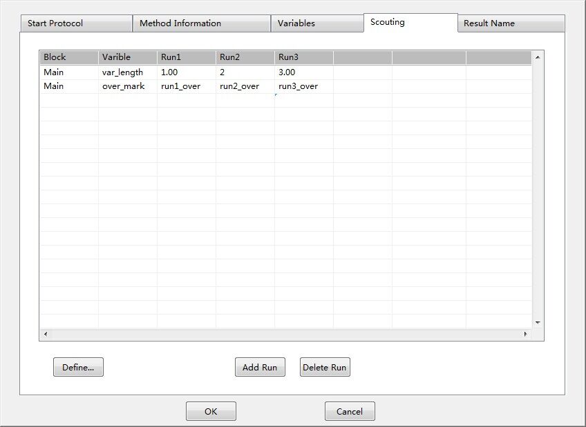 Scouting,即探索功能,通過(guò)將方法中的某些參數(shù)編輯成變量,然后通過(guò)Scouting設(shè)置,將同樣的方法運(yùn)行多次,每次僅僅是自動(dòng)修改方法中的某個(gè)或某些參數(shù),從而實(shí)現(xiàn)參數(shù)的自動(dòng)尋優(yōu),譬如尋找最適合的流速、尋找最適合的裝柱高度等。