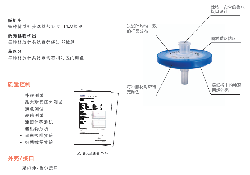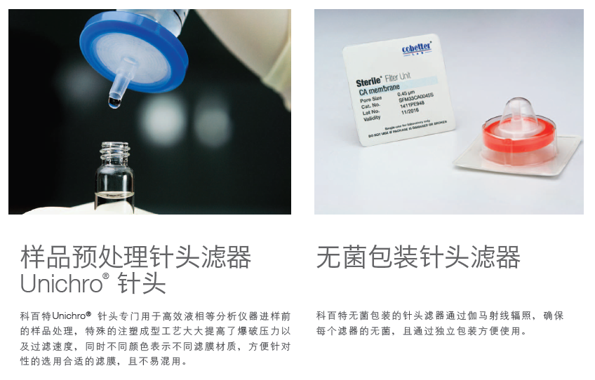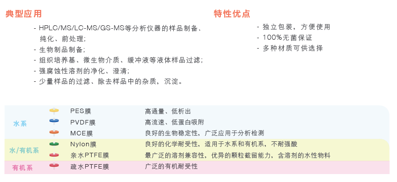 科百特針式過濾器采用PES/PCDF/Nylon/親水PTFE/GF等濾材,以過濾不同性質(zhì)的物料,設(shè)計采用超聲波焊接技術(shù),減少使用時從側(cè)面漏液的風險,同時每個針頭根據(jù)膜材質(zhì)的不同而采用不同顏色標注,為您提供高效、快速的過濾選擇!