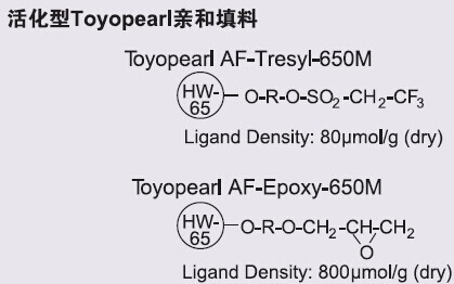 ?????? Toyopearl AF-Epoxy-650M活化型填料,也是干燥包裝,具有高密度的環(huán)氧基團(ca. 800μmol/ml)。在適當?shù)姆磻?yīng)條件下,可用于固定蛋白質(zhì)或低分子配體。當結(jié)合高密度低分子配體時特別有效。例如,谷胱甘肽和甘氨酸的耦合密度可達到大于100μmol/ml濕狀填料。Toyopearl AF-Epoxy-650M是一種多功能的原材料,可連接其他特殊應(yīng)用所需的化學活性基團。這種填料可輕松被激活為含有酰肼的物質(zhì)。這對固定碳水化合物或糖蛋白特別有用。